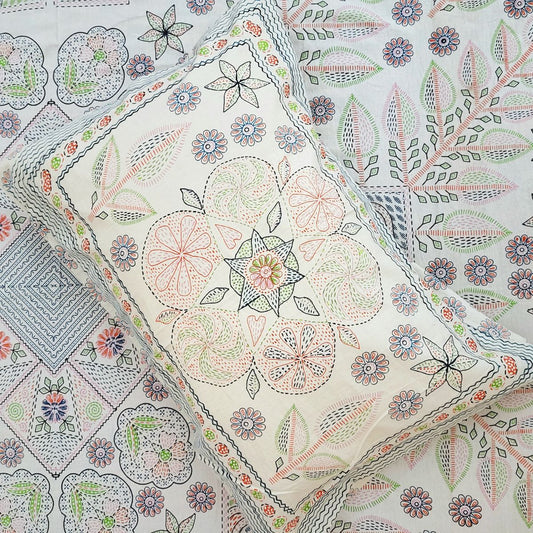 Royal Ethnic Jaipuri Cotton Double Bedsheet, Kantha Ivory